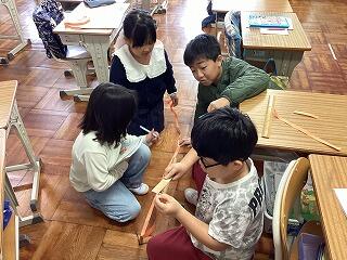 初めはあまり飛ばなかった竹とんぼも,少しずつこつを掴みだんだんと飛ぶようになってきました。