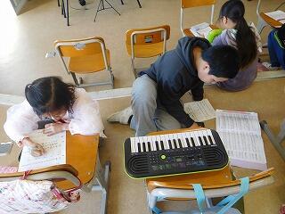 グループは、音の高さがどうなっている人と組みたい、リズムが自分と違う人と組みたいなど、どんな人と組んだら良い曲ができるかを考えて、話し合って作りました。みんな、誰と組んだら良いか決めるために、キーボードで自分や友達の曲を演奏して確かめていました。