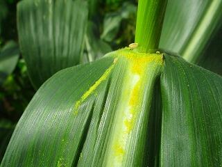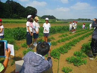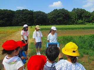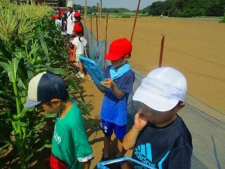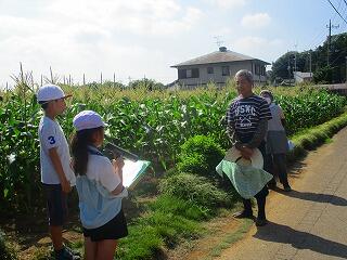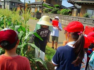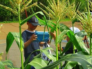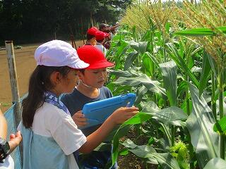 トウモロコシ畑では,大山さんから雄花と雌花や花粉の話を聞かせていただきました。1年生から4年生は,畑で大きくなったトウモロコシの様子を観察しました。
