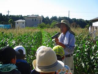 はじめに大山さんから,とうもろこしの収穫についてお話を伺い収穫作業を始めました。