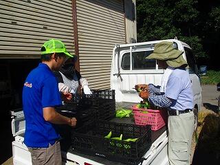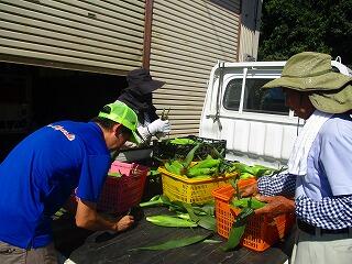 収穫したとうもろこしは,トラックの荷台で大山さんと高橋さんで虫食いがないかの検品作業を行ってくださいました。職員が販売できるとうもろこしの数をチェックしました。