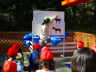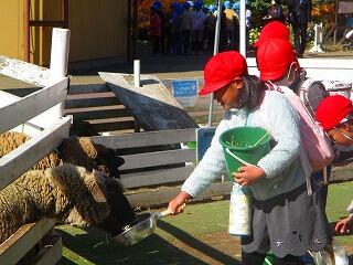 棒に刺して与える餌もありました。子供たちは,テントの下で伺った話を思い出しながら,楽しそうにえさやり体験をしました。