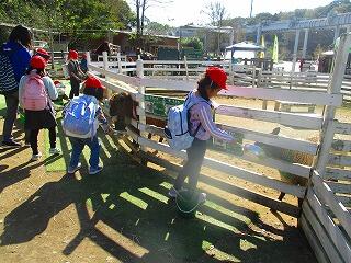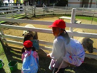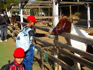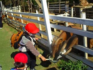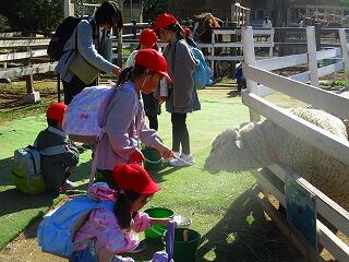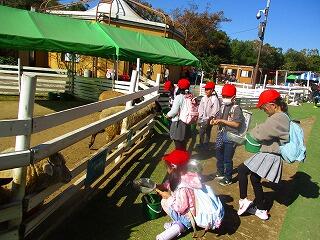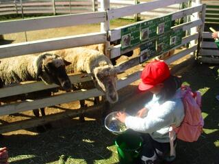 ふれあいどうぶつの里でのえさやり体験です。馬・羊・山羊の中から,動物を選んで体験しました。羊のえさやり体験の人数が一番多かったです。始めに動物公園の担当の方から,上手なえさやりの仕方や注意事項についてお話を伺いました。