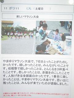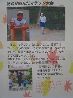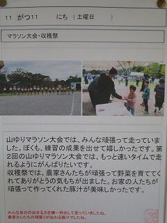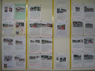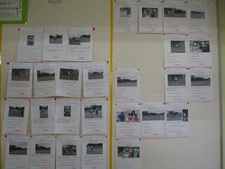 全校児童の収穫祭と山ゆりマラソン大会の振り返りが掲示されています。共有フォルダから写真を選んで枠に貼りつけ,自分の思いを入力して印刷しました。