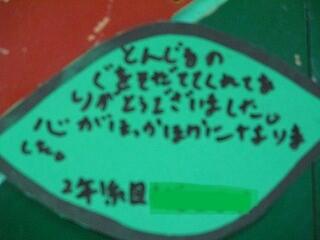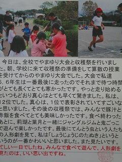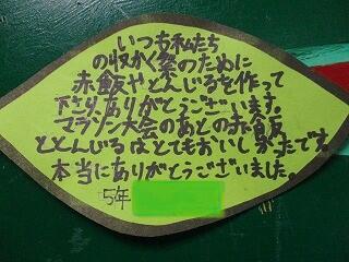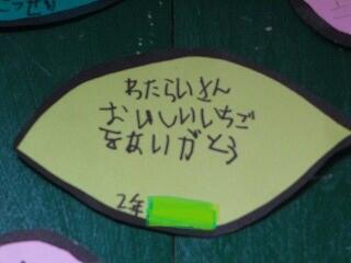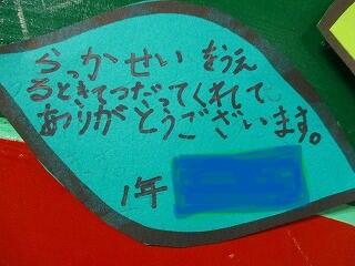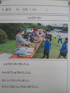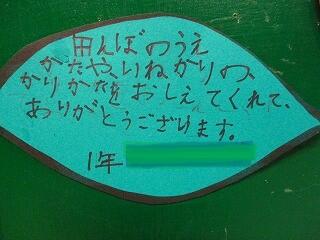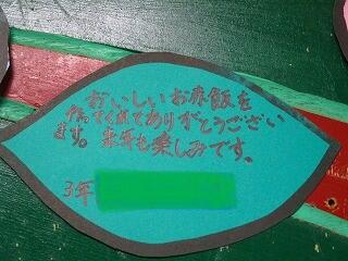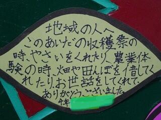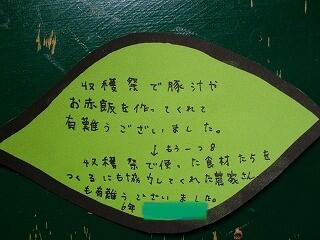 農業体験でたくさんの体験と学びができたことへの感謝,毎朝の登校の安全を見守ってくださる安全ボランティアの方への感謝,収穫祭でお赤飯と豚汁を作ってくださった方への感謝等とそれぞれの子どもが自分の感謝の思いを書いていました。