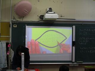 地域の方への感謝の気持ちを書く前に,これまでお世話になってきたことを振り返ります。葉っぱの形の用紙は,掲示するときの方向があるので,スクリーンで確認しています。