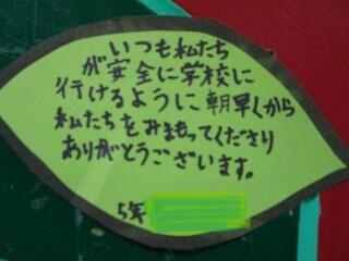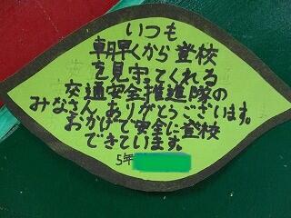 思いやりの木のテーマが変更になりました。農業体験活動や収穫祭,毎日の登校でお世話になっている安全ボランティアの方に感謝の気持ちを葉っぱに書きました。