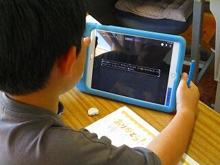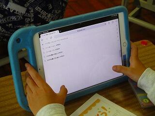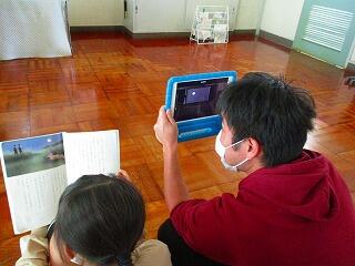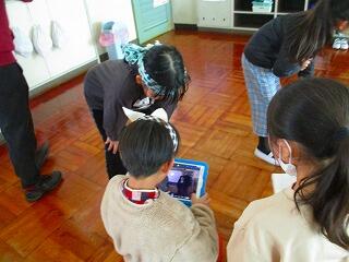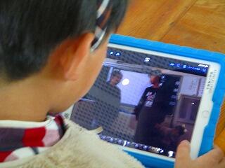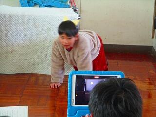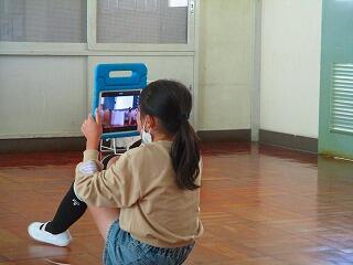 撮影が始まりました。4年生全員が出演していますので,撮影は,担任です。確認した位置をiPadで映しています。