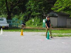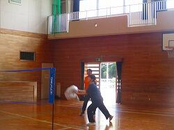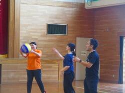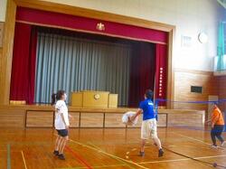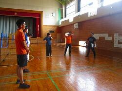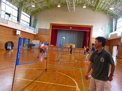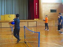 体育館でネット型ゲームの研修会です。相手コートのどこにボールを返したら,勝てるのかを考えながらゲームをしました。