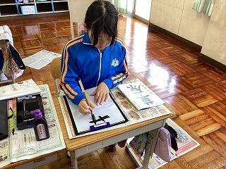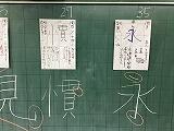 また、本日書写の授業が始まりました。担当は阿部教頭先生になります。今年頑張りたいことを漢字一文字で習字で表現しました。