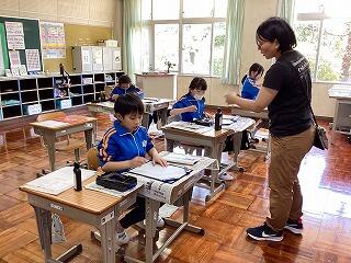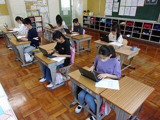 朝の情報の時間はタイピングの練習をしていきます。タイピングで打ち込む内容は校歌です。子どもたちは歌詞カードをよく見ながら集中してタイピングの練習を行っていました。