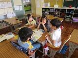 国語では、物語「白いぼうし」の学習をしています。今日は、登場人物の人柄を教科書から読み取りました。「クラゲチャート」という思考ツールを使い、クラゲの頭に考えを書き、足の円の部分にその根拠を書きました。意見交換は、パソコン内だけでなく、自然と会話が始まる姿を目指しています。今日も、少しずつ会話が始まっていました。