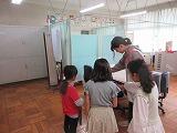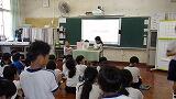 「姿勢」では背筋の伸ばし方やリコーダーの持ち方を教わりました。「息」はゆっくり長く,息を吐いている音も聞こえないように出すと良いことを教わりました。元気で有名な3年生ですが,先生の指示をよく聞いて,ゆっくりと長い息を吐いていました。「タンギング」では,舌の動かし方を教わりました。「トゥ」の言い方で先生の言い方をまねながら練習しました。