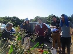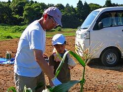 朝から暑い日でしたが,トウモロコシの収穫日です。子供たちが学校から畑に向かっている間に,地域農家の大山さんと職員が打合せを行います。
