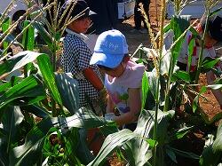 トウモロコシの状態を確認しています。