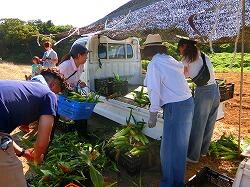 もぎ取ったトウモロコシを数えながらコンテナに並べます。外の葉っぱをはがして買いに来てくれた人が選びやすいようにします。