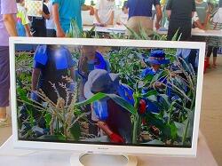 朝の収穫の様子を映像で紹介しました。トウモロコシの順番をお待ちいただく間にお客様にご覧いただきました。