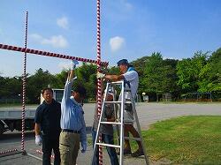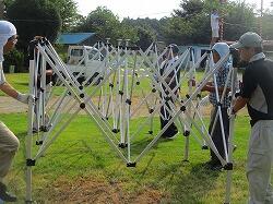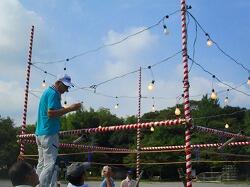 やぐらをたてています。提灯がともるように電気の配線も行います。