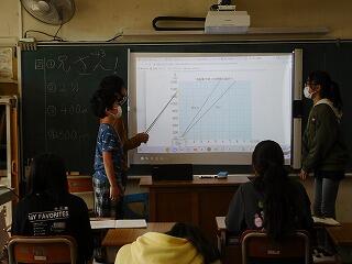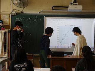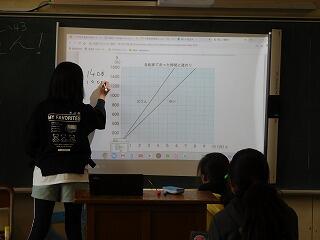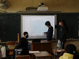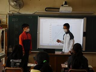 いよいよみんなに発表です。どのグループも息がぴったりで、友達が説明している間にグラフ線を入れたり、漫才のようにかけ合いをしたりで、見ている側も、笑ったり納得したりしていました。