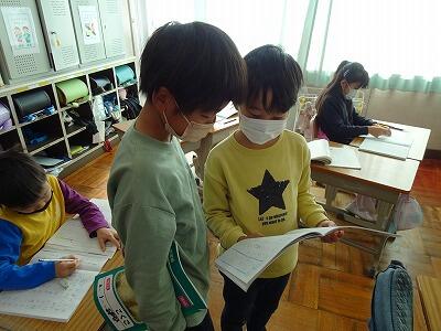 最初はどんな作文にするか、「はじめ」、「中」、「おわり」に分けてメモを書きました。伝えたいことが、「はじめ」、「おわり」できちんと伝わっているか、「中」の内容の、書く順番はそれで良いかを、もう一度チェックし、友達にもアドバイスをもらいました。「最後に一番大事な思い出を書く」、「出来事の起きた順に書く」など、みんなはそれぞれ自分の考えをもって構成を決めていました。写真は、自分のメモを見せて、友達に意見を求めているところです。