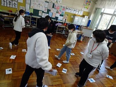 続いては,ABC鬼ごっこ。教室の中を歩きながら逃げるのですが,鬼に捕まると動けなくなります。