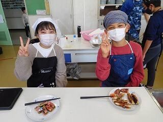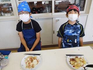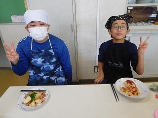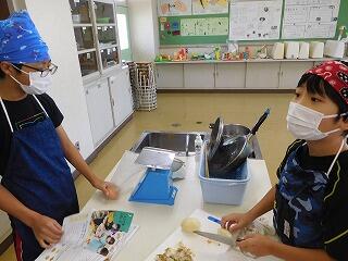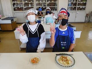 6年生は、赤の食品(おもに体をつくるもとになる食品)と緑の食品(おもに体の調子を整えるもとになる食品)を使ったおかず作りを行いました。1学期に作ったものよりもレベルが高いものが多かったので、苦戦している人もいましたが、計画を振り返ったり、質問したりしながら、おかずを完成させました。