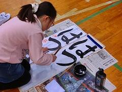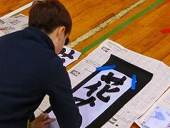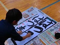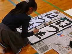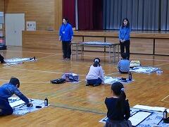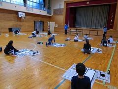 体育館を広々と使い,子供たちは伸び伸びと書いていました。