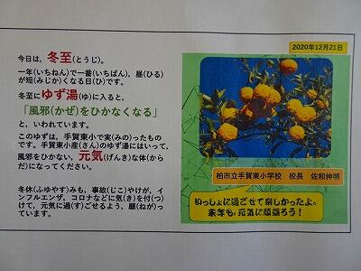 手賀東小産のゆず湯であたたまって,寒さに負けず元気に過ごしてくれることを願っています。(校長 佐和)