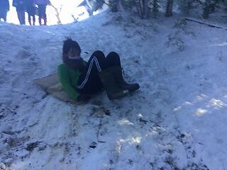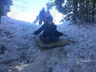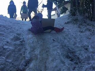 4年ぶりに積雪を観測して校庭は一面、真っ白な世界となっていました。今日は雪遊びで6年生と一緒にダンボールスキーをして遊びました。なかなか経験できないことなので、とても楽しそうに遊んでいました。