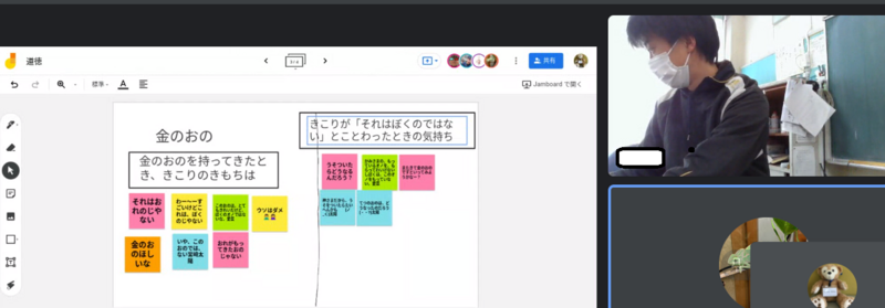 オンライン学習で道徳をしました。家庭からでも意見や感想を伝え合うことができあました。学校で取り組む児童とオンライン学習の児童の意見交換ができ子ども達は満足していました。(第2学年 齊藤)