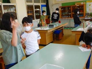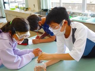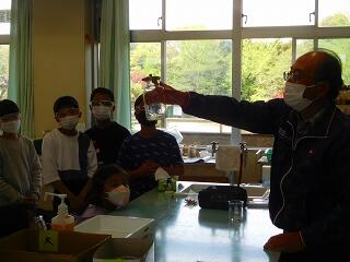 写真は,石灰水を入れて変化を調べているところです。白くにごるのがよくわかり,二酸化炭素が増えたことがしっかり確認できました。