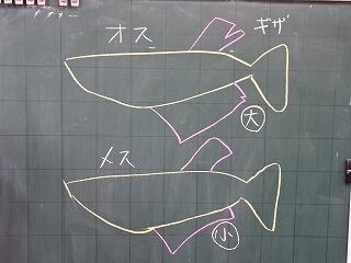 ついでに私から、「なぜ、オスとメスのヒレの形が違うのか?」質問しました。