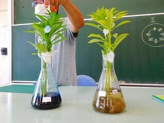 理科では,ホウセンカを使った実験をしました。ホウセンカが根から吸った水は,どこを通って全体にいきわたっているのかを調べます。ホウセンカの根をきれいに洗い,1つは色のついた水を入れた三角フラスコ,もう1つはただの水を入れた三角フラスコに入れます。