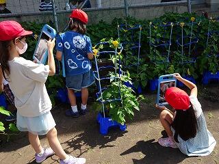 本日も、朝の涼しいうちに、1年生がアサガオの観察や端末での記録をする姿や、6年生が白いホウセンカを使って、植物の水や養分の吸収について学んでいる姿が見られました。