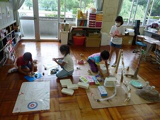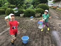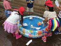 今日は,昨日自分たちで作った船や水鉄砲,しゃぼん玉で遊びました。どうすれば水鉄砲が勢いよく出るのか考えたり,どうしたらしゃぼん玉が割れずにできるか考えたりしながら遊びました。初めは上手くできないことも何度か試していくうちにできるようになりました。しゃぼん玉がふわふわと空へ上がり校舎の上まで飛んでいった時には歓声があがっていました。みんな大はしゃぎで楽しんでいました。