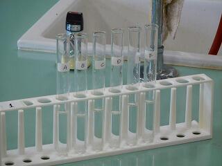 6年生は、理科室で6つの水溶液を当てる実験をしました。A~Fの試験官に入った水溶液の名前を当てます。