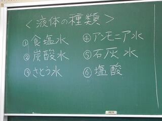 食塩水、炭酸水、砂糖水、アンモニア水、石灰水、塩酸のどれかが入っています。見た目は全部、無色透明です。