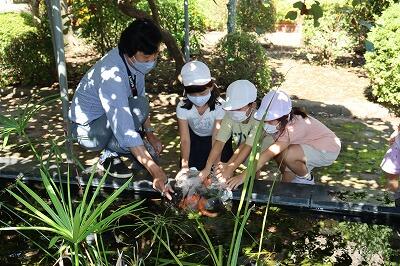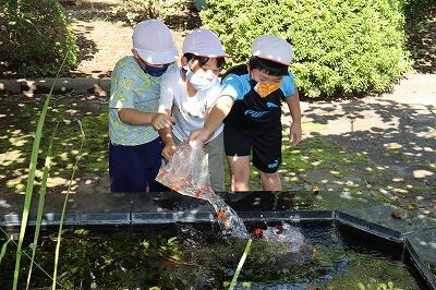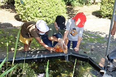 2年生の子供たちと、大きくて立派な金魚を池に放しました。