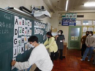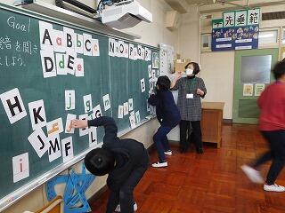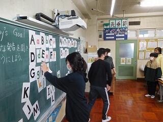 スタートしたら、各グループ一人ずつ黒板の前に出てきて、アルファベットの大文字と小文字をマッチングさせて順番に並べていきます。一人につき、「A」と「a」などの一文字ずつを並べ、交替します。