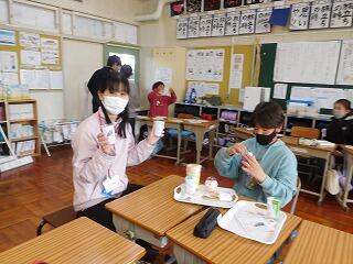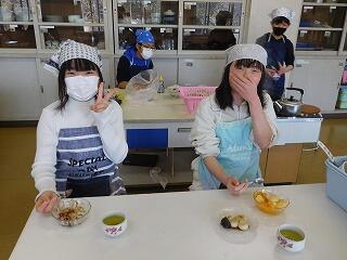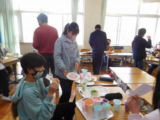 6年生は、白玉を作り、お茶を淹れました。昨年度はコロナ禍の影響で調理実習ができませんでした。本当は5年生の学習で行う白玉作りでしたが、最後の調理実習で、6年生の仲間たちで団らんをすることができました。