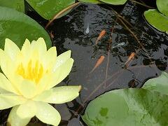 メダカがはいっている鉢に,睡蓮の花が咲きました。