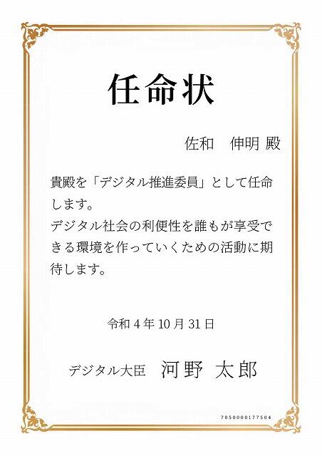 デジタル庁より、デジタル推進委員の任命状をいただきました。