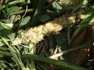 畑の近くだけでなく、広い範囲できれいに食べられたトウモロコシが落ちていました。