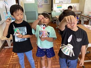 今日の図工は、紙コップを2つ使ってクルクル回るてるてる坊主を作りました。