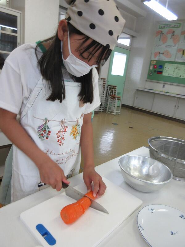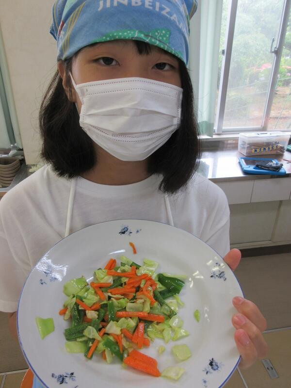 メニューは野菜炒めです。児童一人一人が自分の分の材料を用意し,一生懸命調理を行いました。
