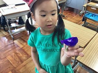 1年生が育てている朝顔は順調に成長し,花も付き始めています。そこで,生活科の時間に観察を行い,花を押し花にすることにしました。