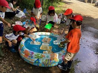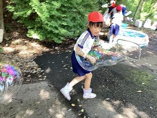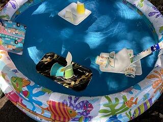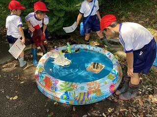 今日は,以前から計画をしていた「なつとなかよし」の水遊びの日でした。生活科の時間に自分で作った水鉄砲や船,シャボン玉で遊びました。船を作る時は,どんな船にすれば沈まずに良く進むかを考えて作りました。