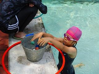 潜れる人は,水中にあるボール(お宝)を探してきます。一人で何個もバケツに入れています。