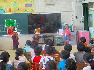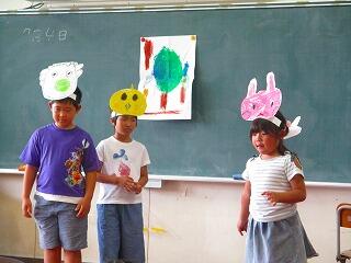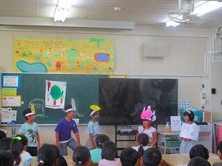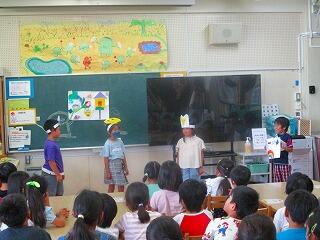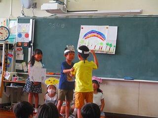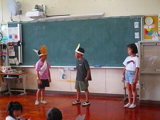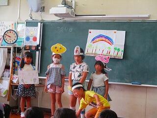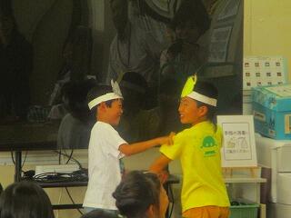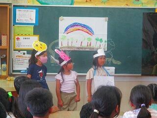 劇の練習では,動作やせりふを忘れてしまったり,声が後ろまで届かなかったりしていましたが2日後の本番では,立派な劇を見せてくれました。みんなの前で自分を表現し,たくさんの拍手をもらった2年生。終わった後の笑顔は自信に満ちていました。