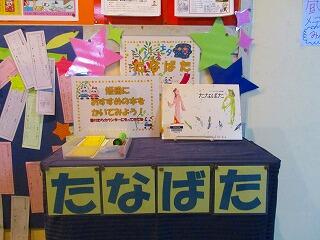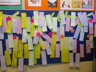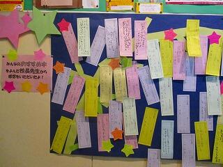 廊下では,七夕の短冊が飾ってあります。子供たちのおすすめの本が短冊に書かれています。絵本・物語・伝記など種類豊富に紹介してあります。おすすめの本コーナーもあります。